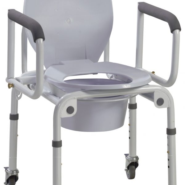 Steel Drop-Arm Commode with Wheels and Padded Armrests