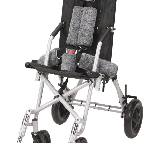 • Positioning pelvic belt and five-point harness with padded strap covers. The reversible padded strap covers increase comfort and one side of cover is imitation lamb’s wool and the other is velour.